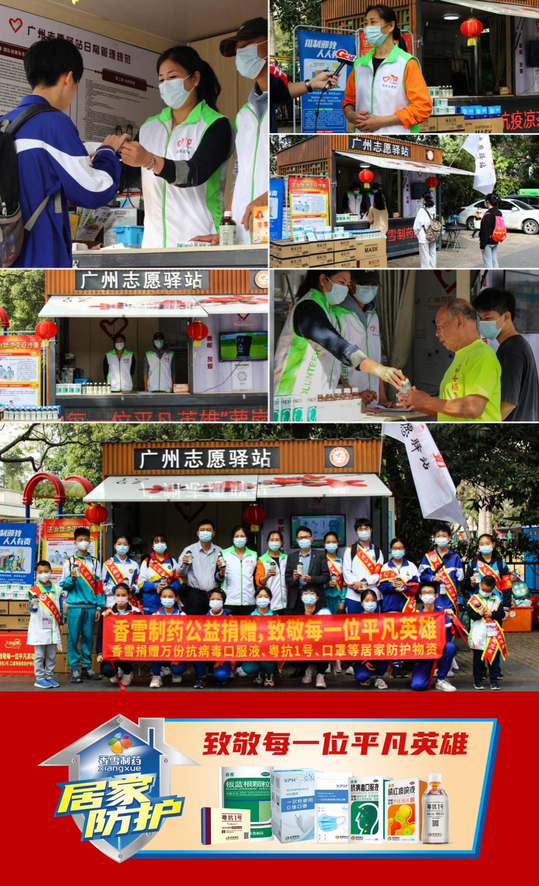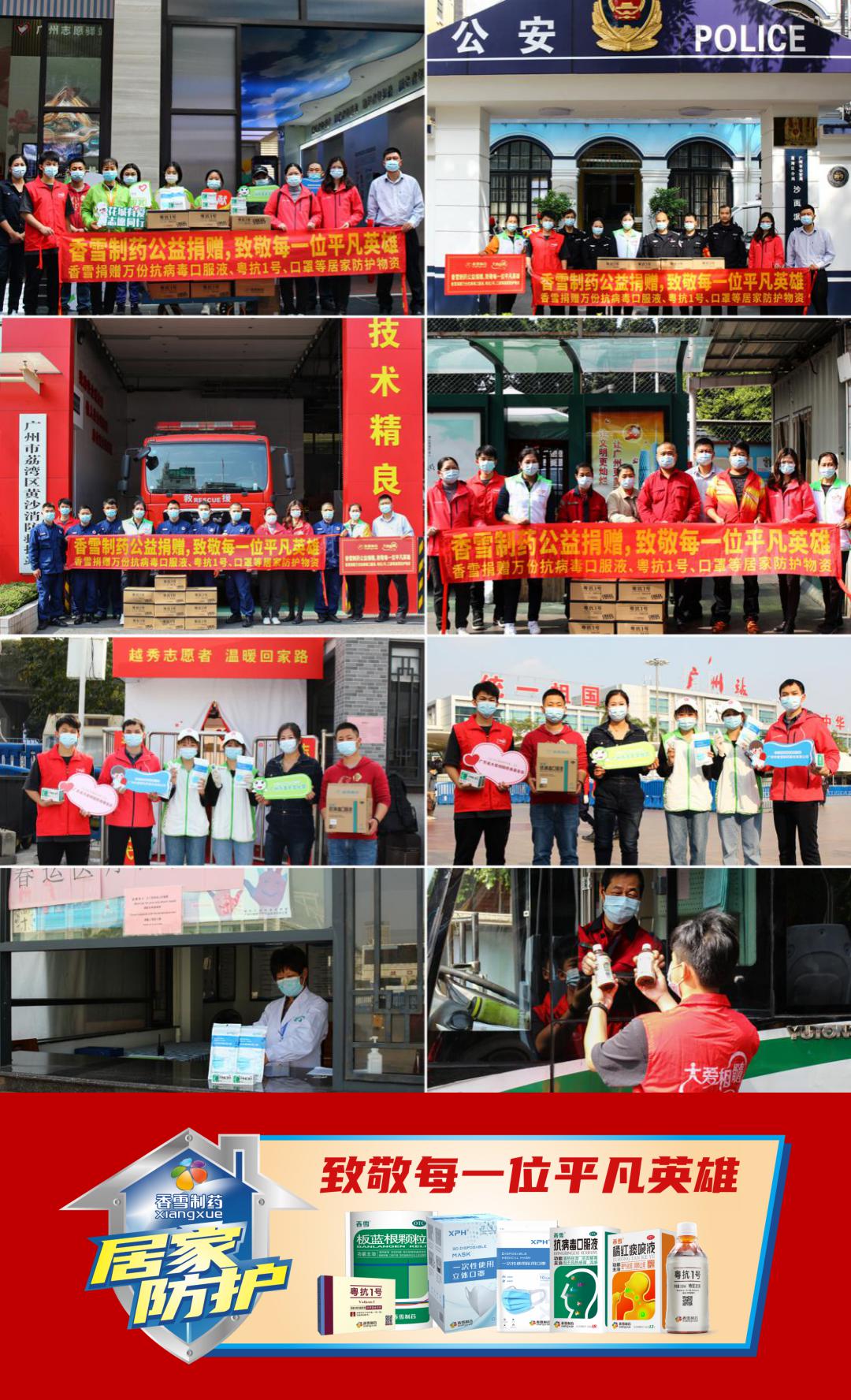 随后,先后组织向湖北、广东、湖南、宁夏等地卫生部门、学校、抗疫一线人员以及海外30个国家等捐赠抗病毒口服液、橘红痰咳液、粤抗1号等防疫物资和研发资金,累计捐款捐物超过1700万元,助力一线人员打赢疫情防控阻击战,与全国人民同舟共济,共克时艰。