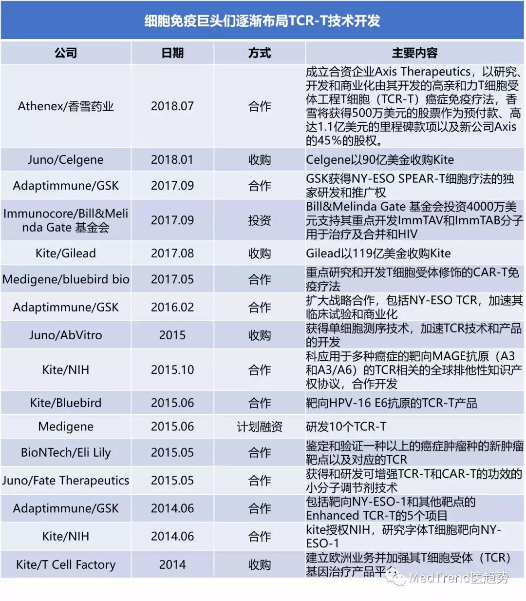 ▲细胞免疫巨头们逐渐布局TCR-T技术开发