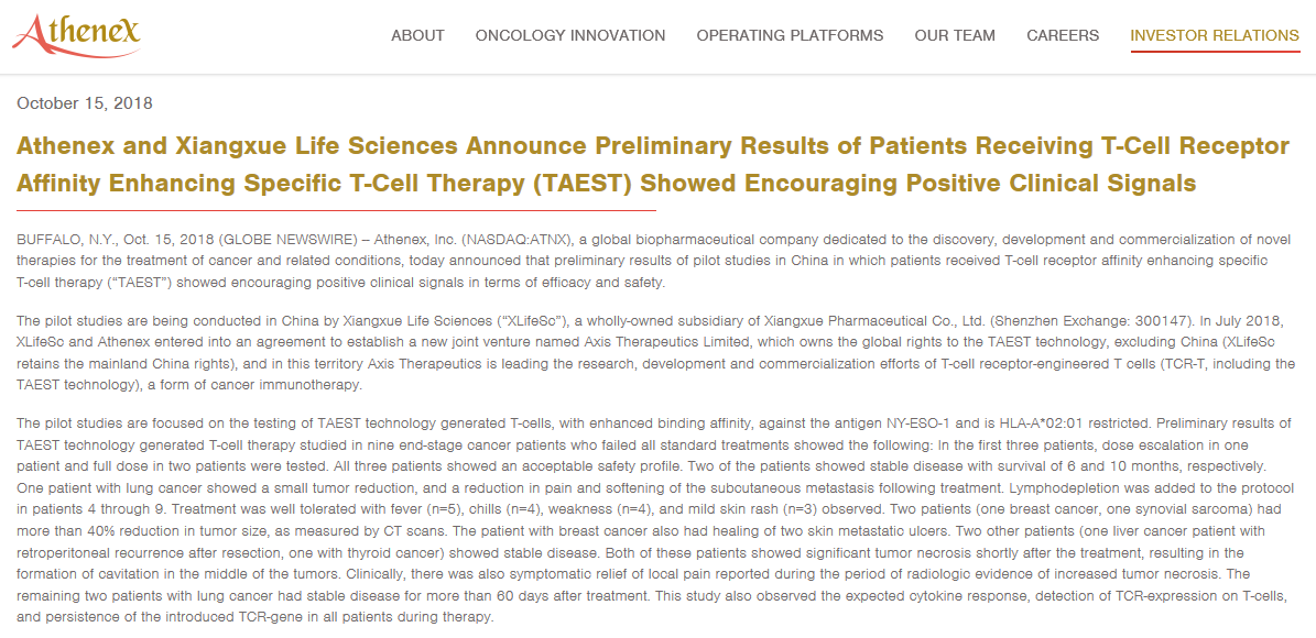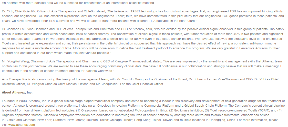 美国Athenex官网新闻链接: