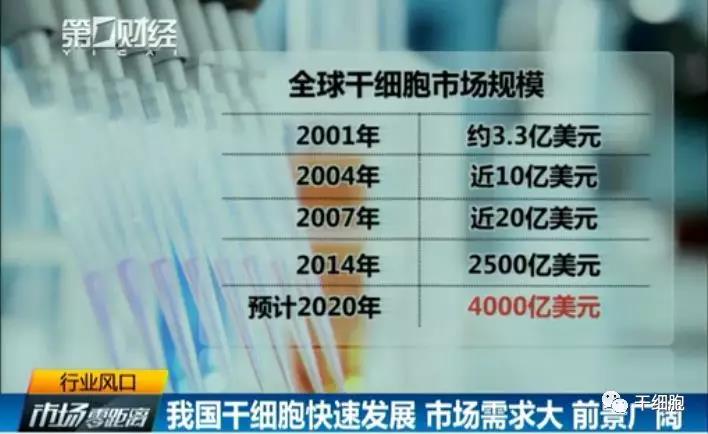 第一财经频道:全球干细胞市场规模2020年将达到4000亿美元!市场需求大,前景广阔!