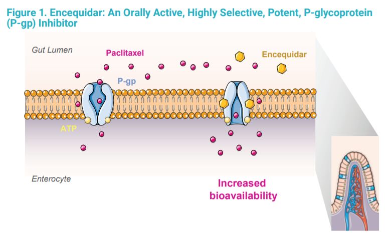 Athenex公司开发的口服紫杉醇配方由紫杉醇和新型P-糖蛋白(P-gp)抑制剂encequidar组成。Encequidar是该公司口服药物研发平台的基石。P-gp是一种活跃于胃肠道表面的转运蛋白,许多抗癌药物是P-gp的底物,当口服时,这些药物被P-gp运送回胃肠道,限制它们的吸收。